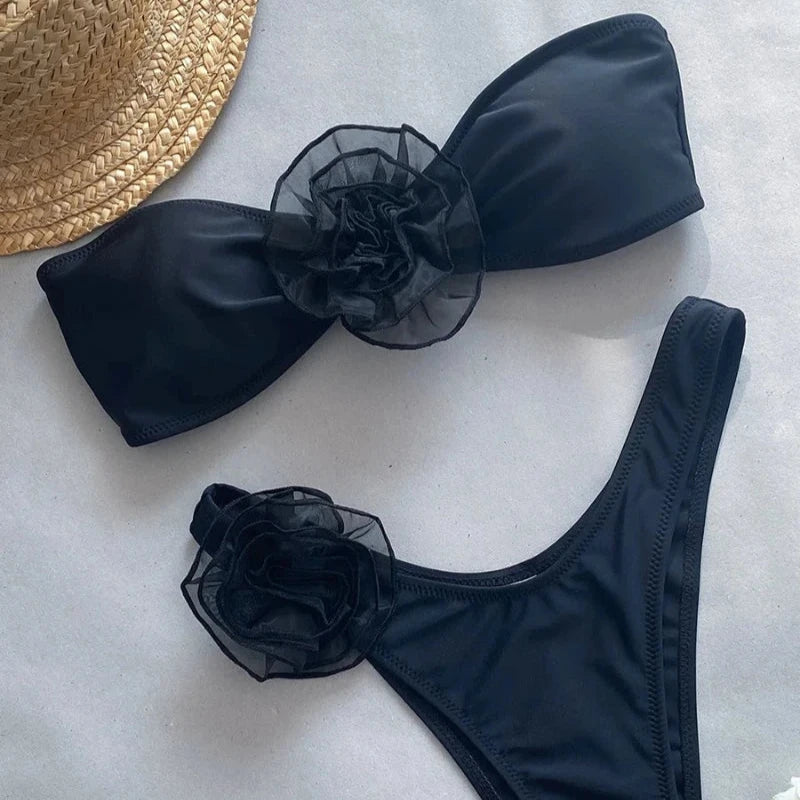Com um padrão de flores coloridas sobre um fundo suave, este biquíni é ideal para realçar a beleza natural e o espírito leve dos dias de calor. Combina perfeitamente com acessórios de palha, chapéus de aba larga e um par de óculos de sol para um visual de verão que transita elegante e fresco.